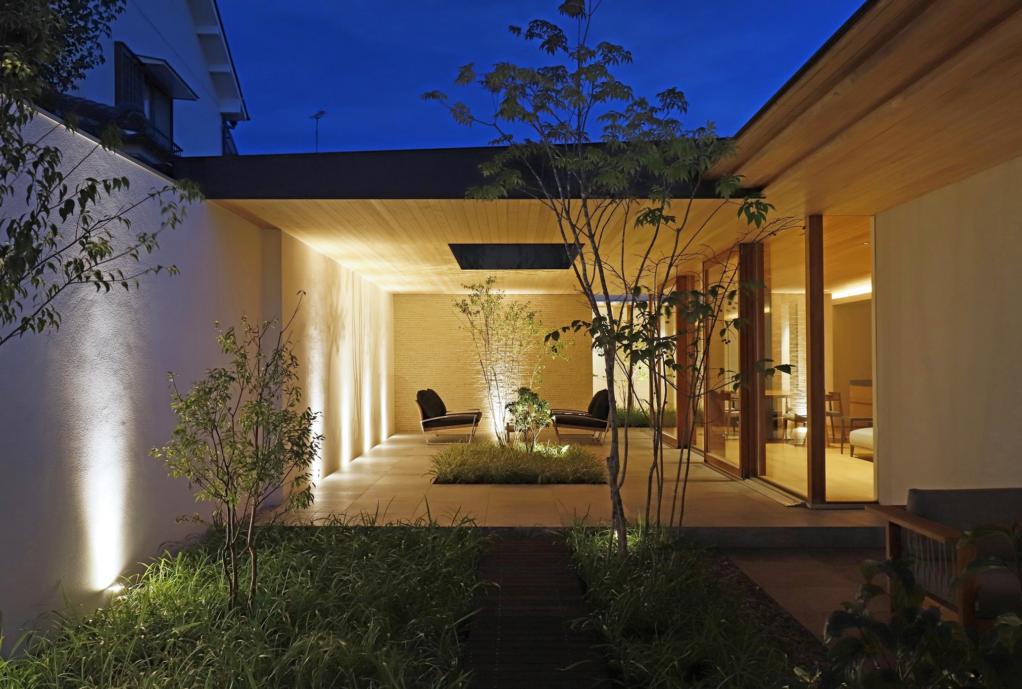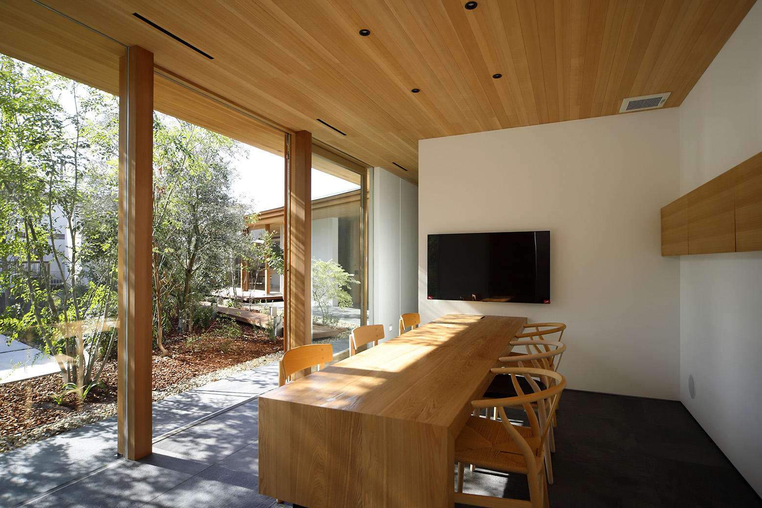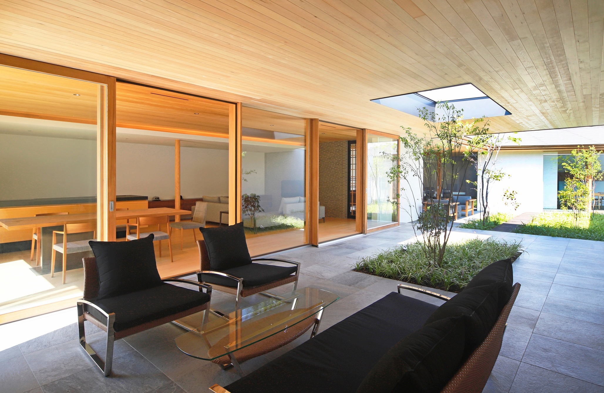 ビルトインガレージ2台分のスペースを備え、板張りの天井と中庭のある平屋が完成しました。